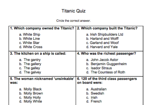 Titanic Quiz Questions And Answers Free Online Printable Quiz Without Registration Download Pdf Multiple Choice Questions Mcq from kupidonia.com A quiz that only true titanic movie fans will get. Quiz quiz which has been attempted 1847 times by avid quiz takers. Apr 15, 2021 · titanic quizzes & trivia. May 12, 2020 · try this amazing the ultimate titanic movie trivia! Although some of the details of the story were based on what actually happened on the rms titanic, the plot of the movie revolved around the fictional … Theatres went out of the reel while titanic was being played in cinemas and paramount had to send out replacement reels. Jan 27, 2019 · titanic characters trivia questions and answers. 9 questions covering the things you should know about the hit movie, titanic.